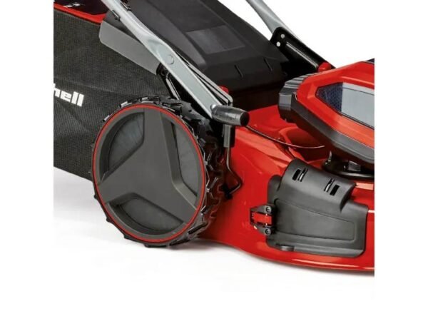 Der Akku-Rasenmäher ist mit einem höhenverstellbaren und klappbaren Führungsholm ausgestattet. Dadurch kann er perfekt an jede Körpergröße angepasst und platzsparend verstaut werden. Als Highwheeler verfügt der Akku-Mäher über erhöhte Hinterräder, die das Arbeiten – zusammen mit dem Selbstfahrantrieb mit variabler Geschwindigkeitsregulierung – in schwierigem Gelände erleichtern. Seine großflächigen Räder schonen zudem den Rasen. Für beste Sicht auf den Mähbereich sorgen die LED-Lichter am Motorkopf des Rasenmähers.