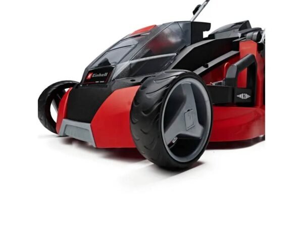 Als Highwheeler verfügt der Rasenmäher über erhöhte Hinterräder, die das Schieben in anspruchsvollem Gelände erleichtern. Der klappbare Führungsholm ermöglicht eine platzsparende Lagerung und lässt sich in der Höhe individuell auf den Verwender einstellen. Der schlanke Griff ist mit einer Gummierung versehen und verfügt daher über eine hervorragende Haptik. Dank des praktischen Tragegriffs lässt sich der Rasenmäher zudem einfach transportieren. Für eine sichere Verwendung sorgt der zusätzliche Totmannschalter, der für das sofortige Ausschalten des Motors sorgt, sobald dieser losgelassen wird.