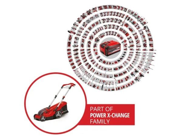 Der Akku-Mäher arbeitet mit dem Power-X-Change-Akkusystem von Einhell. Das Set enthält 2 Akkus mit einer Kapazität von jeweils 4,0 Ah. Die Akkus mit je 18 V Spannung sorgen in Kombination für 36 V Systemspannung. Das mitgelieferte Schnellladegerät Power-X-Twincharger kann 2 Akkus gleichzeitig aufladen. Du kannst auch andere passende Akkus der Power-X-Change-Serie aufladen und mit dem Rasenmäher einsetzen. Möchtest du den Mäher nach getaner Arbeit verstauen, so lässt sich der höhenverstellbare Führungsholm einfach einklappen.