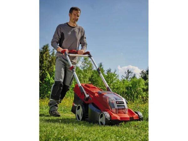 Der Einhell-Mäher ist mit großen Hinterrädern ausgestattet, was ihn besonders manövrierfähig macht. Die Schnitthöhe lässt sich in 6 Stufen über einen Hebel von 25 mm bis 75 mm verstellen. Der Grasfangsack fasst 45 l und hat eine Füllstandsanzeige. Aufgrund seiner geringen Schnittbreite eignet sich dieser Mäher vorrangig für kleine und mittlere Gärten. Falls du einen Akku-Rasenmäher für größere Flächen suchst, könnte der Einhell GE-CM 36/43 Li M passen. Dieser Mäher verfügt über eine Schnittbreite von 43 cm und ist in verschiedenen Varianten lieferbar.