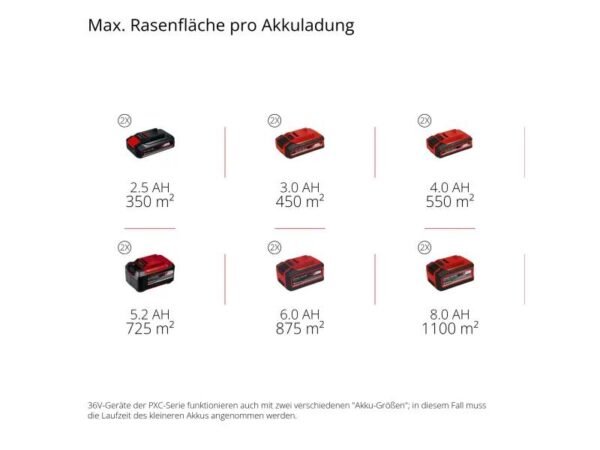 Der Akku-Rasenmäher Rasarro 36/42 wird mit zwei 5,2 Ah Power X-Change Akkus und einem Twincharger zum gleichzeitigen Laden von zwei Akkus geliefert. Der Mäher wird für Rasenflächen bis 725 m² empfohlen.