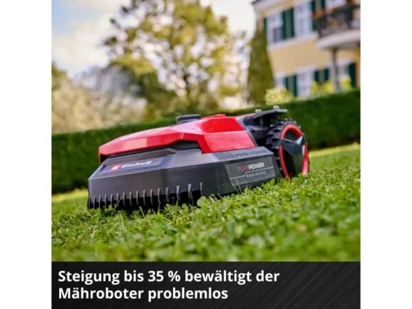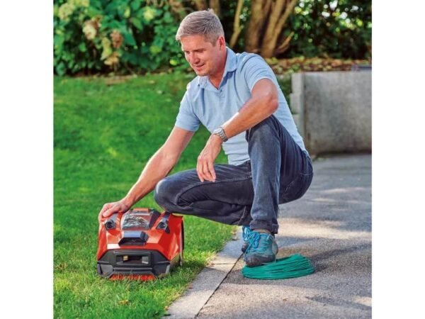 Die Rückkehr zur Ladestation und der Ladevorgang erfolgen automatisch bei Bedarf. Auch ein Regensensor ist integriert. Der Mähroboter bietet eine Schnitthöhenverstellung von 20 mm bis 60 mm und ist für Steigungen bis zu 25% geeignet. Ein Tragegriff sorgt für einen komfortablen Transport.