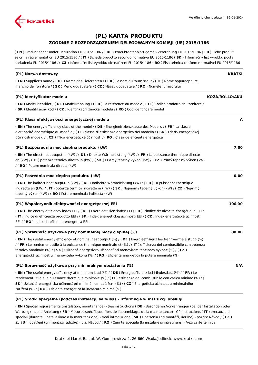 Technische Daten Kaminofen Kratki ROLLO/W | |