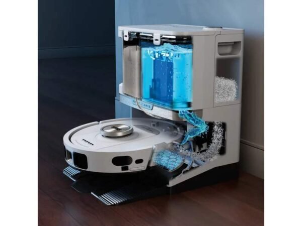 Wenn der Roboter zur Basisstation zurückkehrt, füllt die Basis den Tank des Roboters automatisch mit sauberem Wasser auf. Der Tank fasst 1,7 Liter Wasser für eine Wischfläche von bis zu 4.000 Quadratmetern und speichert Schmutzwasser vom Wischpad für bis zu 30 Tage.