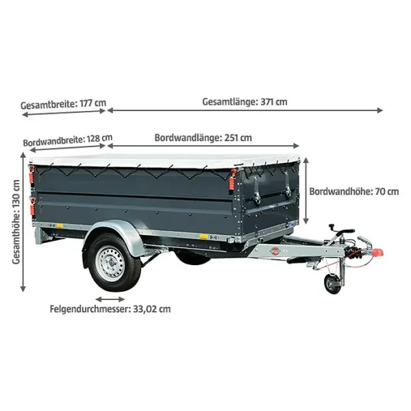 Der Bordwandaufsatz hat eine Höhe von 35 Zentimetern und sorgt damit für ein Ladevolumen von 2,2 m³. Die Beschichtung der Bordwände schützt vor Korrosion. Bei Bedarf kann die Flachplane mit der mitgelieferten Flachplanenstütze am Anhänger montiert werden.