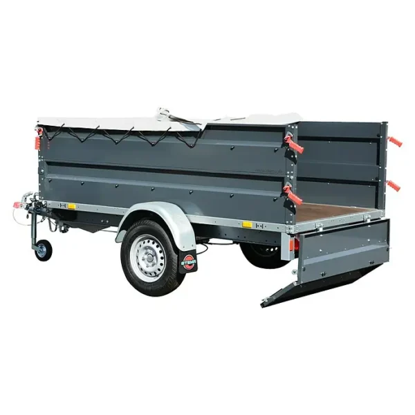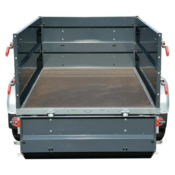 Die Rückwandklappe ist klapp- und abnehmbar und erleichtert die Beladung. Mit integrierten Stoßdämpfern und Auflaufbremse ist der Anhänger bis zu 100 km/h zugelassen. Die rutschgehemmte Oberfläche lässt in Kombination mit den teilversenkten Zurrösen eine gute Ladungssicherung zu.
