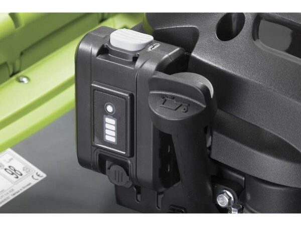Ausgestattet mit einem Lithium-Ionen-Akku ermöglicht er einen komfortablen Start per Knopfdruck. Der Motor sitzt auf einem robusten Stahlblechgehäuse, das für die nötige Sicherheit beim Rasenmähen sorgt. Der Fulcrum-Holm kann seitlich in eine Richtung verstellt werden, was das Mähen besonders dicht an Wänden und Hecken erleichtert, ohne dass der Nutzer selbst in der Hecke verschwindet. Im Lieferumfang sind die Starterbatterie, das Ladegerät und der 60 Liter Hardtop-Fangkorb enthalten.